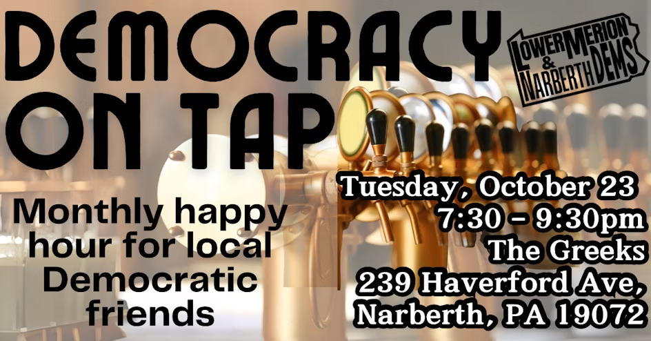 Join your local Democratic friends for a fun happy hour gathering taking place on the 3rd Tuesday of each month! We'll be traveling to venues across Lower Merion and Narberth as we catch up with longtime Dems and meet new friends. This is an informal space for our vibrant Democratic community to come together for...